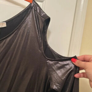 She’s gorgeous! This is such a perfect top for standing out in the room. Beautiful metallic color, stretchy, flattering and sexy. She’s in perfect condition. Husband doesn’t want me to sell! 😍