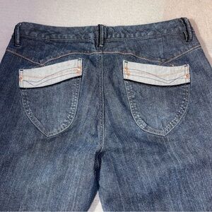 (two in front and two in back). The pockets are outlined with a bronze metallic stitching. Zipper and button front with belt loops. Measurements are waist 36”, length from waist to bottom 32”, inseam 24” and bottom of pants 8”.