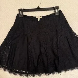 This black mini skirt by Joie showcases a stunning lace design that exudes elegance. Its flared silhouette is fitted at the waist and gracefully widens towards the hem, making it an ideal choice for a cocktail occasion. The hem is beautifully finished with a more intricate lace trim, adding to its sophisticated charm.