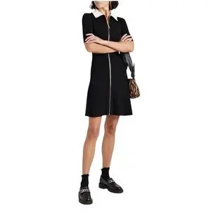 Maje Black Ribbed Collared Zip Mini Dress. Front zip closure. Contrast wing collar. Gold-toned hardware.
