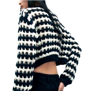 ZARA NAVY & BLUE CROPPED CROCHET POCKETED SWEATER M