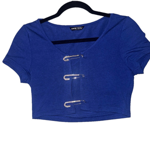 Stylish blue crop top. Features unique safety pin details. Perfect for casual wear.