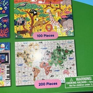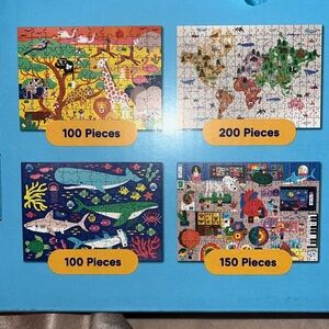 Kids puzzles with a 100 piece under the sea puzzle, 100 piece puzzle, 150 piece museum puzzle and 200 piece world map themed puzzle