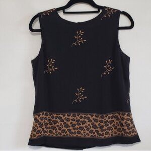 Sleeveless blouse with a unique button back close. Round neckline Black with gold tan leaf and leopard print pattern. 100% silk with 100% polyester lining