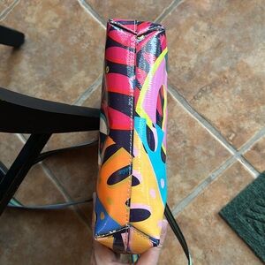 Only used once or twice. Beautiful palm print. Inside is green sparkle. Thin with woven fabric straps.