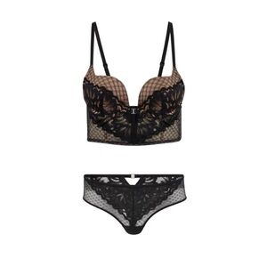 Plunge push-up bra, with a dramatic curved neckline and keyhole front. Lace overlay and novelty mesh, matching cheeky panty. Adjustable straps, underwire. Bra: 34B, Panty, XS. So pretty and sexy! Perfect addition to anyone's lingerie collection. NWOT.