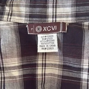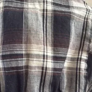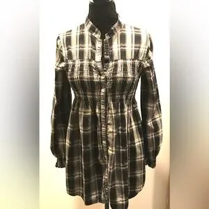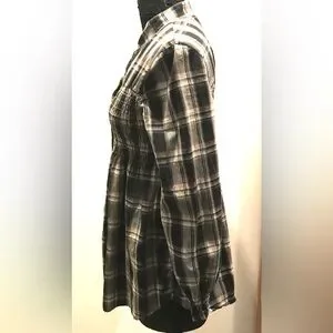This gorgeous black. brown and white plaid long shirt is so versatile! You can wear them with skinny jeans, shorts or wear over tights and cowboy boots! This shirt covers the buttocks and hits almost mid thigh on me. I love the elastic breast and puff long sleeves with elastic wrist and ruffle. Label says L but the fit can be S, M, and L due to the gathering at the breast plate. Mannequin measures 36 Bust, 28 waist, 38 hips. Gorgeous detailing with Nehru collar and metal snap buttons. This does not apply to the Super Bowl sale.
