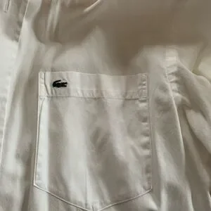 Men’s white Lacoste button down long sleeve dress shirt. Button down collar. Lacoste size 38. Men’s small. Front pocket 100% Cotten.