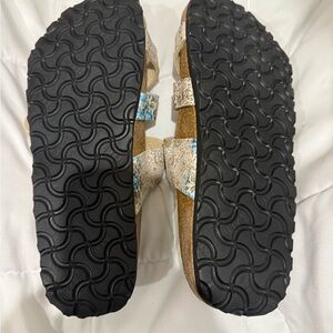 Stylish Birkenstock sandals with floral design. Features adjustable buckles. Perfect for casual wear.