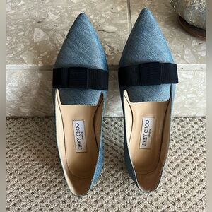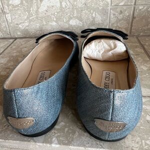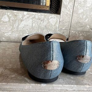 Jimmy Choo Gala flats In a shiny denim with black tow.