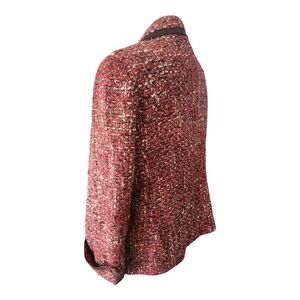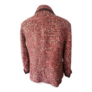 Chic Talbots tweed jacket. Features red and black hues. Elegant design with chain detail.