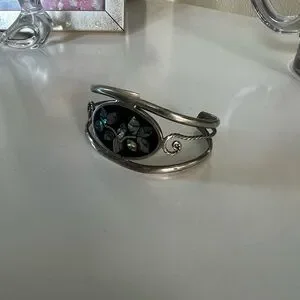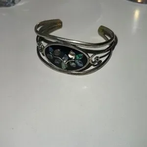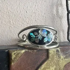 Elegant vintage silver bracelet featuring a stunning abalone inlay, leafy design. Perfect for adding a touch of sophistication to any outfit. It has signs of wear and faded stamp inside. Please carefully view all photos to see condition.