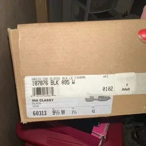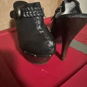 Stylish platform heels with a buckle detail. Black upper with brown wooden heel. Perfect for a night out.