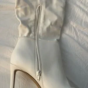 Elegant white high heel boots. Stylish zipper detail. Perfect for any occasion.