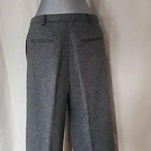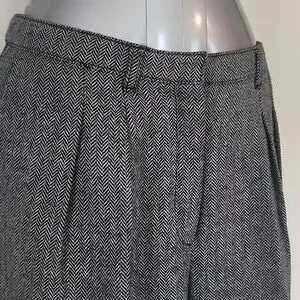Mango gray wool trousers with herringbone pattern, double pleat at front, and welt pockets at back. Button and crossover hook at front. Mid rise and medium to wide leg. Perfect for the quiet luxury trend.