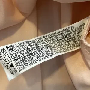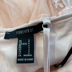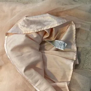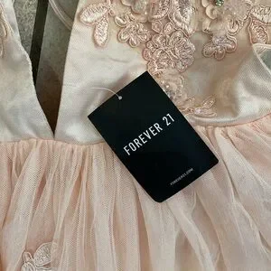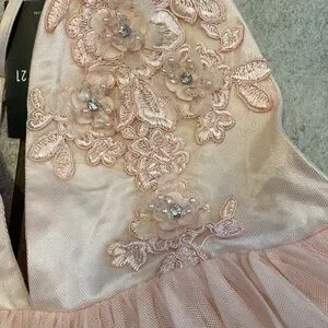 Beautiful blush pink color on the full length formal dress. Skirt is tulle and fully lined. Bodice is silky with lace and bead accents. Adjustable spaghetti straps. Cris cross open back. Sleeveless. New with tags.