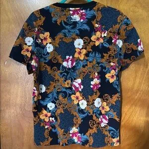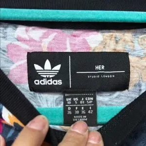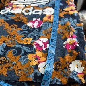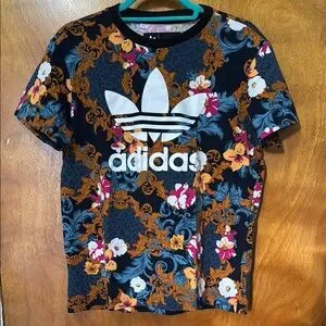 Vibrant Adidas tee with a bold floral design. Features a large logo on the front. Perfect for casual wear.