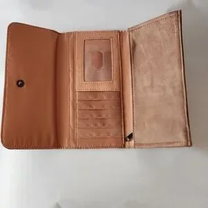 Gorgeous brown suede wallet with a stylish feather accent. Pre-owned and in great condition. Features, 2 bill pockets, 5 credit card slots and a secure zip coin pocket.