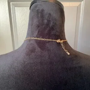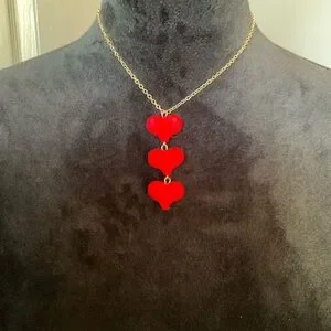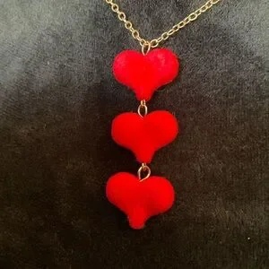 Elegant necklace with three red heart pendants. Gold chain adds a touch of luxury. Perfect for any occasion.