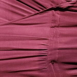 Elegant burgundy wrap dress. Features a flattering V-neckline. Perfect for any occasion.
