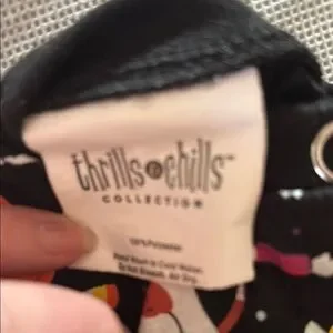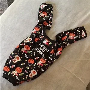 Cute Halloween-themed dog costume. Long sleeve cotton tee. Features pumpkins and candy designs. Perfect for festive occasions. Worn once.