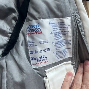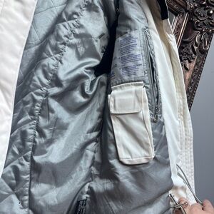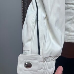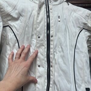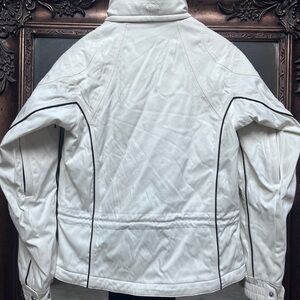 This white ski jacket features a zip-up design with a high collar for added warmth. The fitted silhouette is complemented by textured fabric and stylish seam details, making it both functional and fashionable for cooler weather.