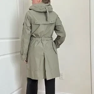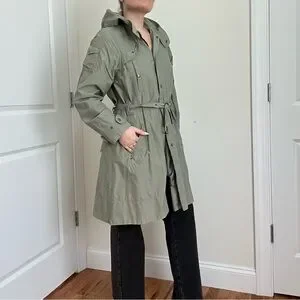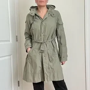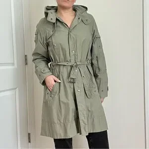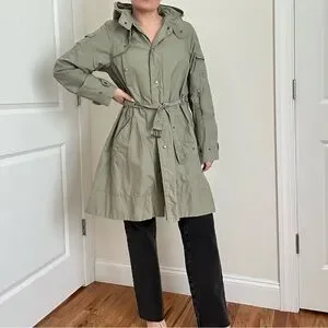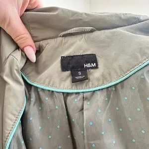 This lightweight trench coat from H&M in a muted sage green features long sleeves with adjustable cuffs and a belt at the waist for a defined silhouette. Its casual yet practical design makes it ideal for mild weather or light rain. Pre-owned, in good condition.