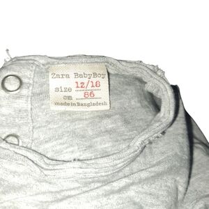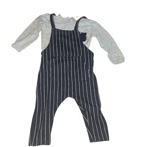 Zara stylish matching set for kids. Includes gray long-sleeve top. Navy overalls with white stripes. Comfortable and trendy.