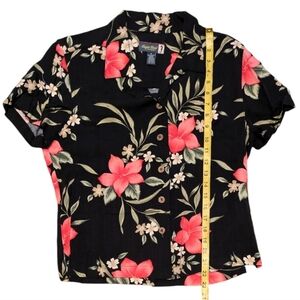 Embrace the upcoming "Bold Botanicals" trend with this stunning Sugar Reef top, featuring a captivating black background adorned with large, vibrant pink and white flowers. This button-down short-sleeve shirt is the perfect blend of comfort and style, ideal for a tropical getaway or adding a pop of color to your everyday wardrobe.