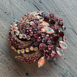This stunning vintage brooch showcases a beautiful floral-inspired design in vibrant shades of purple and pink. Adorned with numerous small round stones that reflect light, it creates a dazzling effect. The piece is crafted from a silver metal, enhancing its overall elegance. Measures 1-3/4” in diameter.