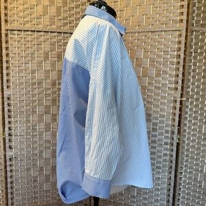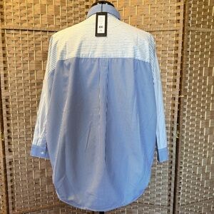 Two different blue stripes work together to make a super cute tunic blouse. Collar and placket, one patch pocket at breast. Long sleeves w/ cuffs. Longer length in the back w/ two pinch darts at the hem. New, never worn. Size XL; oversized, loose fit.
