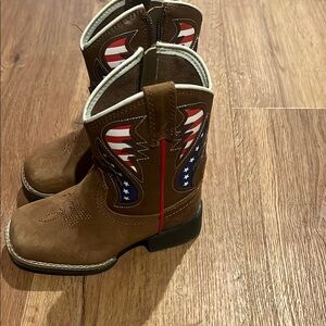 Stylish Ariat cowboy boots. Features American flag design. Perfect for a bold look.
