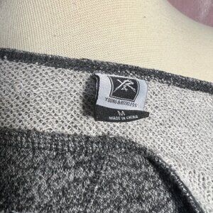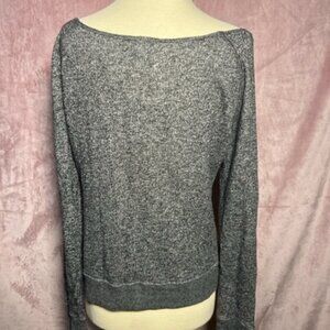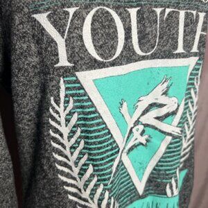 This is a womens Gray Off the shoulder Reckless Youth Shirt Sweater Material In A Size Medium. This Shirt Is used And Has tiny Peeling And Color Fade But Still looks Good.