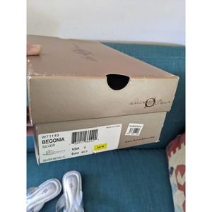 These Born sandals showcase a stunning silver metallic upper with a wide strap that elegantly crosses over the foot. The thong-style design features a decorative circular ornament at the center, enhancing their sophisticated look. Designed with a flat sole, these sandals provide comfort for all-day wear.