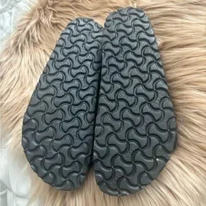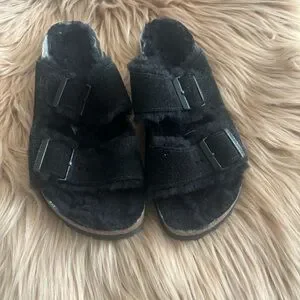 BLACK SUEDE SHEARLING BIRKENSTOCK SANDALS, SIZE 39, GOOD CONDITION.