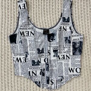 Trendy tank top with newspaper print. Features bold text and images. Perfect for casual wear.