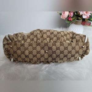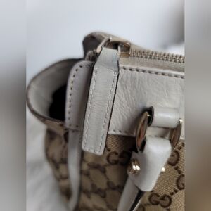 Overall : Good condition, normal signs of wear. No odor. Minor residue at the edge of closure zipper; minor creasing at trim; shape relaxed due to wear. Golden tone accessories are color fading.