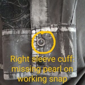 Please refer to photos for measurements and condition of the item. Please NOTE that the cuff on the right sleeve has a missing pearl on the snap closure. Snap closure is in working condition.