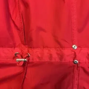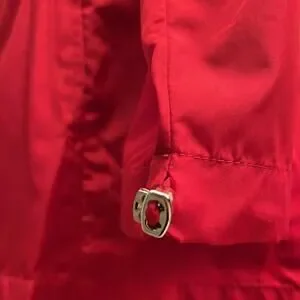 Long Sleeve Unlined Red Packable Rain Jacket. Zipper Front. Pit to Pit 21". Length 29". Item 502