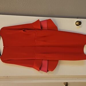 This elegant red and pink dress features stylish ruffled sleeves, perfect for any occasion. Its classic design offers a sophisticated look.