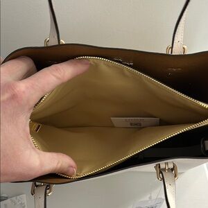 This Coach tote bag features a beautiful cream color and a structured design, making it perfect for everyday use. Crafted from textured leather, it includes two thin straps and elegant silver-toned hardware for a touch of sophistication.