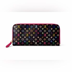 Made in Spain Date • Pink Interior • Louis Vuitton Wallet • Limited Edition Takashi Murakami • Black Coated Canvas • Multicolor Monogram Pattern • Brass Hardware • Leather Trim • Leather Lining • Snap Closure Interior Pockets: Twelve card slots, two zip pockets, two large flat pockets, one short flat pocket, and a D-ring tab Closure/Opening: Double snap closure Interior Lining: Pink colored cross-grain leather interior Hardware: Gold-toned Height: 4.33" / 11cm Width: 8.26" / 21cm Depth: 0.78" / 2cm Absolutely beautiful condition with minor callouts (as shown in photos)
