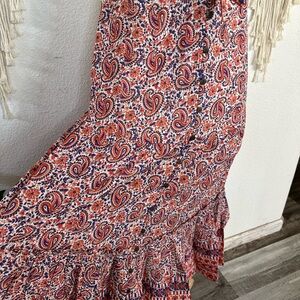 Embrace bohemian style with this paisley print dress. Featuring a flattering spaghetti strap design, this dress is perfect for any casual outing. The vibrant reddish orange and blue colors add a touch of elegance.