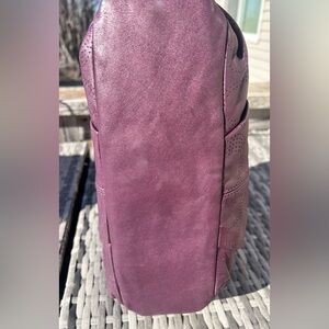 This fantastic Coach is such a lovely shade of purple. The perforated C leather is soft and classic. Strap features a buckle accent and buckle cinches also decorate each side. The strap is currently in the doubled position but can be extended to be worn as a crossbody.