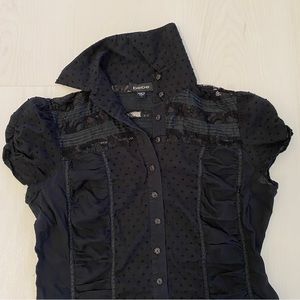Bebe black ruched dotted Swiss blouse with rhinestone buttons