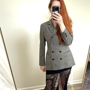 Elevate your professional wardrobe with this sophisticated double-breasted blazer. Featuring a timeless heather gray wool blend fabric, structured shoulders, and classic black button closure. The perfect jacket for everyday looks with jeans and skirts.