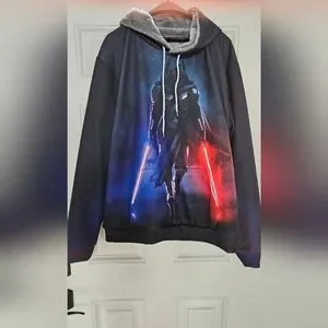 Stylish Star Wars hoodie featuring a character with red and blue lightsabers. Perfect for fans. Brand new no tags, never worn.