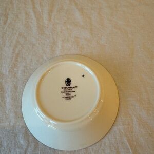 This exquisite. Wedgewood bone China wild strawberry fruit bowl features a stunning white surface adorned with a delicate floral and leaf pattern in vibrant green, complemented by hints of red or burgundy. The elegant design is framed by a sophisticated metallic rim, making it a perfect addition to any dining table.5” diameter x 1” deep