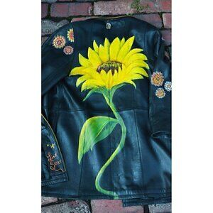 Vintage black leather coat; hand painted fiber art, sunflower sz M