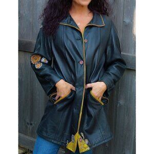 Vintage, supple, black leather, mid-thigh length coat with sunflower mandala buttons and citrine amulet dangling from back collar. Hand painted shades of yellow, gold and green with collaged fabric, fiber art images. Earthy, boho vibe.